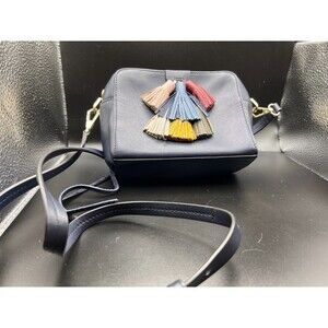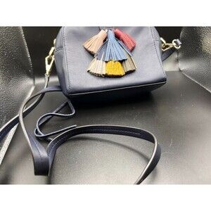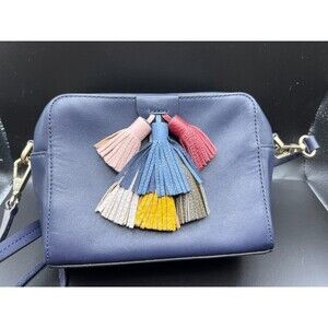 Rebecca Minkoff Sofia Tassel crossbody in navy leather with 6 different color tassels on the front.