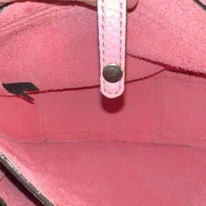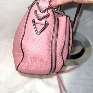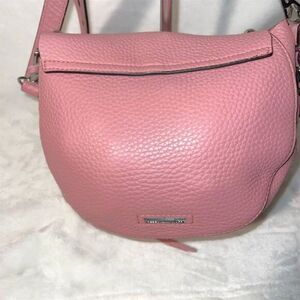 This Rebecca Minkoff saddle bag is crafted from leather in a vibrant guava pink color. It features a crescent shape with a studded accent and an embossed logo. The bag has a flap closure with a magnetic snap and an adjustable strap for convenience. This item is pre-owned.