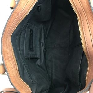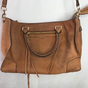 Stylish tan crossbody bag. Features dual handles and fringe details. Perfect for everyday use.