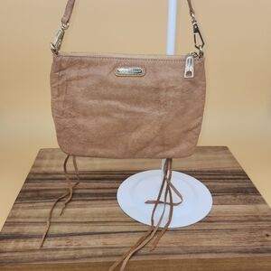 Stylish and versatile, this Rebecca Minkoff crossbody bag in tan is perfect for any occasion. Its sleek design and neutral color make it a must-have accessory. cute fringe off of of the zippers.