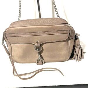 The Rebecca Minkoff crossbody bag is crafted from genuine leather in a taupe color, featuring a chain strap and adjustable shoulder strap for versatile wear. It includes a zipper closure and tassel detail. Suitable for casual outings or evening events, this bag offers both style and functionality. It is in excellent used condition and comes from a smoke-free, dog-friendly home.