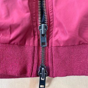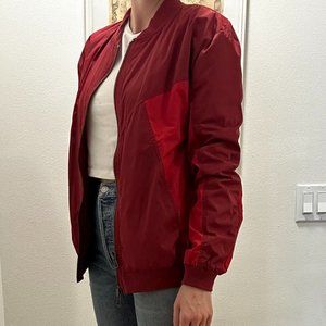 Two-tone red jacket by Rebecca Minkoff in a water-resistant and wind-resistant nylon.