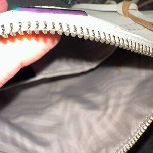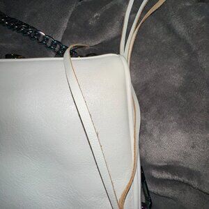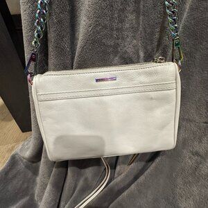 Crafted from smooth, white leather, Rebecca Minkoff’s ‘Mini Mac’ cross-body bag comprises a zip top fastening to the lined interior compartment complete with a slip pocket. Featuring an external zip pocket to the front secured with a large dog leash clasp, the bag is detailed with oil slick iridescent effect metal hardware.