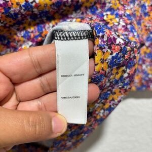This is a medium-sized Rebecca Minkoff shift dress with a ditsy floral pattern in multicolor. It features long sleeves, a square neckline, and a pullover closure. Made of a blend of nylon, spandex, and rayon, this knee-length dress is lightweight and suitable for casual occasions in the summer, fall, and spring. It has a casual sleeve style and is not vintage.