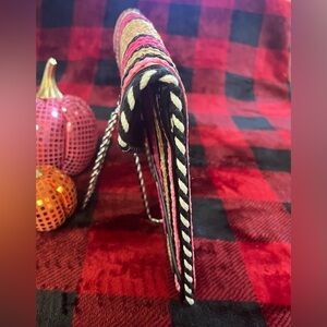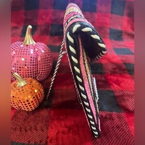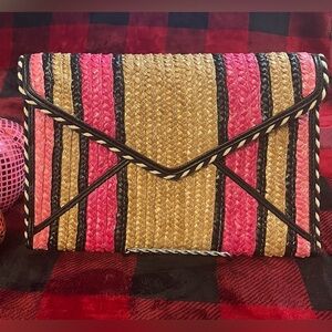 Women's envelope clutch from Rebecca Minkoff. Woven from multi-coloured straw to form a striped, colourbock design, the