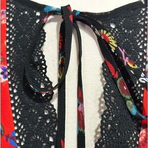 A pretty floral print and a bold colorblock design give this bohemian Rebecca Minkoff dress a dramatic feel. Sheer lace trims the V neckline, and colorful tassels secure the keyhole neckline and cuffs.
