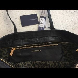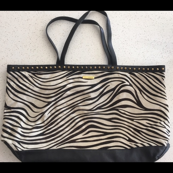 This zingy tote is made from zebra printed hair calf and leather. It is 100% authentic and has the Rebecca Minkoff signature cotton interior lining. It has approx. 19" two top handles with 7" drop. Perfect for the girl with an adventurous style who can't get enough animal print in her life! I wore this tote a few times and is in like new condition. Measures approx. 20"W x 13"H x 5"D