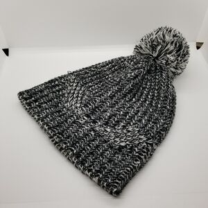 Black and white knit hat with a pom pom on the top. Exterior is in great shape, interior has some makeup stains on the tag that did not come off when washed. See photos for fabric and care details.