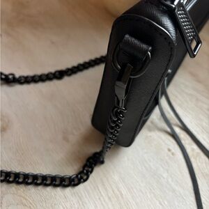 Elegant black crossbody bag with chain detail. Ideal for versatile styling.