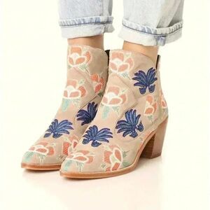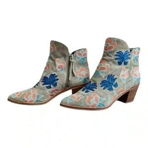 Lulu Too Suede, almond toe, side zipper embroidered western bootie. Size 9