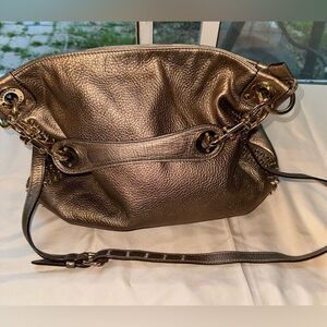 Excellent condition Rebecca Minkoff bronze metallic two way bag. There is a beautiful attached handle with gold tone hardware and a heavy zipper. The crossbody strap is an adjustable buckle with gold tone grommets. The sides have studded insets in gold tone hardware. There is no wear on this entire bag. It is very heavy, between 3-4 pounds. It reminds me a lot of my Chloe Paddinton purse in size and weight. Open to reasonable offers. The purse is definitely more bronze. That color was not an option.