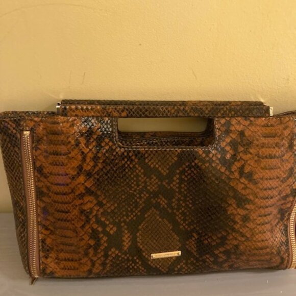 Vintage Rebecca Minkoff brown snakeskin clutch with magnetic closure and handles. Zippers expand the capacity of the bag for all of your late-night rendezvous.