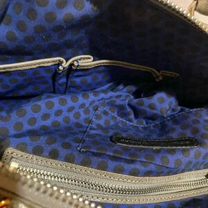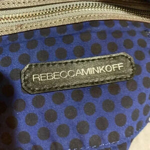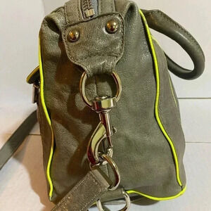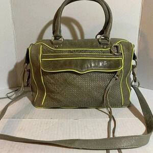 Rebecca Minkoff grey/ green leather satchel handbag with silver tone hardware main compartment 4 pockets at interior wall 1 zip closure & zip closure at top fabric lining zip pocket closure at center 4 protective metal foot base exterior corners have some marks peeling hight 10.5” width 13” depth 6.5” strap drop 6” shoulder strap The dimensions are based on approximately measurements before placing an order please check take a moment to view all photos using feature for a closer look