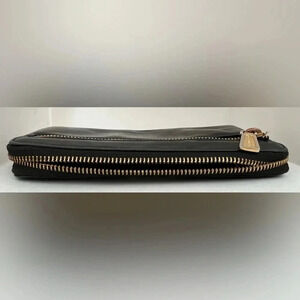 Womens Rebecca Minkoff full zippered closure wallet. Gold REBECCA MINKOFF metal logo plate on the front. On the back is a zippered closure coin purse. The interior has 8- card slots, 4- billfold size slide in slots, 1- zippered closure coin purse. The zipper pulls are gold and silver metal with REBECCA MINKOFF logo on them. Beautiful smooth black leather. Good, used condition.
