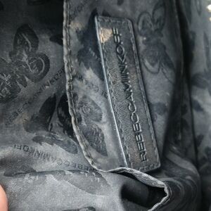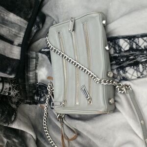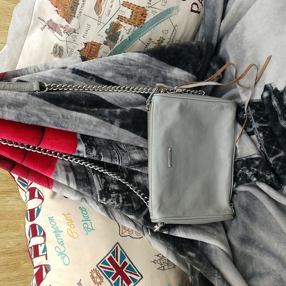 gray leather purse silver hardware detachable chain. inside does have a few makeup marks outside does have some rubs noted in corners please refer to pica