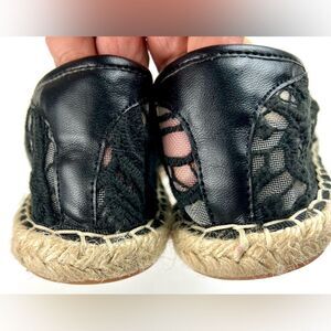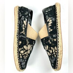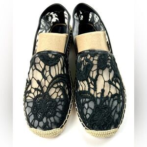 NWOT Rebecca Minkoff Genny espadrille flats. These Rebecca Minkoff espadrilles feature a sophisticated black lace overlay against a tan background, creating a striking contrast. The traditional jute sole adds a touch of rustic charm to the elegant design, making them perfect for casual outings. With a slip-on style and rounded toe, these shoes offer both comfort and style. Reinforced round toe, pull on style and cushioned footbed.