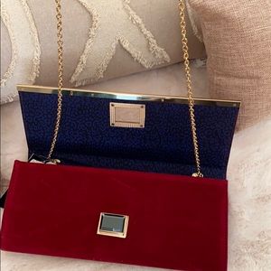 Rebecca & Rifka envelope style evening handbag in a beautiful burgundy color. Has a gold chain handle that stores on the inside. Measures 13 inches wide by approximately 5.5 inches. New with tags.