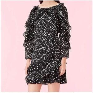 Rebecca Taylor Dress 2 XS Black White Mini Midi Polka Dot Ruffle Long Sleeve NWT