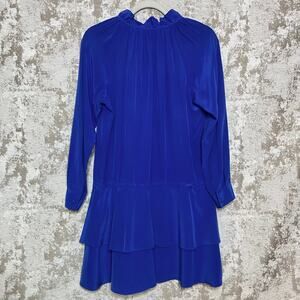 Gorgeous dress from Rebecca Taylor! Features domed button front, dropped waist, adjustable tie, short ruffle collar, full length sleeves, single button on the cuffs, double tiered skirt, 100% silk fabric, and bright cobalt blue color throughout.