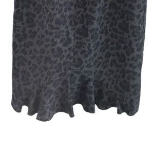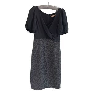 Rebecca Taylor Cheetah Print Dress. This wool and silk sheath dress skims the body perfectly. It has a black silk top, gray and black cheetah print wool skirt with a ruffle hem at the back and a sexy neckline.