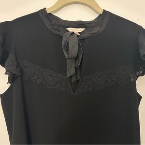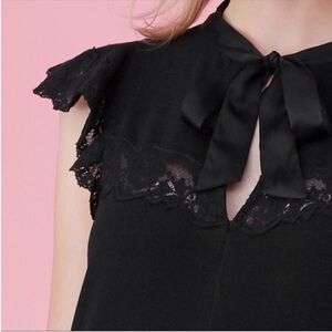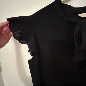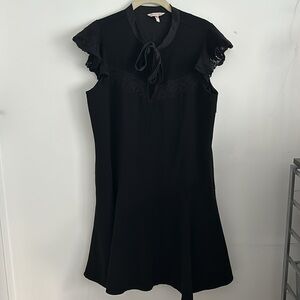 Gorgeous dress in great condition! Adorable lace detail on sleeves and throughout top of dress. Dress has ribbons to tie in the front but can be left open as well. Functional zipper closure on side. Slip underneath.