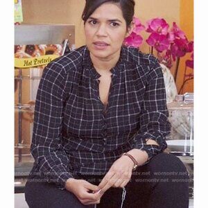 Rebecca Taylor Black and White Plaid Silk Long Sleeve Top. Women's size 2. 100% silk. Worn by America Ferrara (Amy) on the sitcom, Superstore. Victorian-inspired with a ruffled mock neck, covered buttons and bows at the cuffs. Lightweight. Perfect for fall layering under a blazer. Like-new condition. No visible flaws. Smoke-free home.