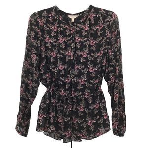 Pretty floral print velvet burnout sheer top in a silk blend fabric with button front, drawstring waist, and long sleeves.