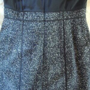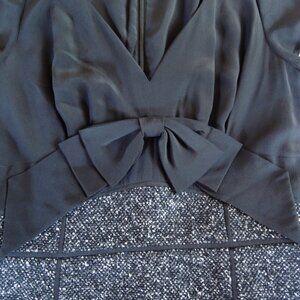 Rebecca Taylor black silk and wool tweed dress with bow detail, size 8. Looks simple on the hanger but this elegant silk & wool dress has lovely tailoring that makes it fit just right for a smooth, sophisticated line. Top is black silk with V neck, cap sleeves, and bow detail beneath the bust. Lower portion is fitted black, gray & cream tweed with vertical and horizontal black seam accents. Classy, with an understated yet festive vibe. Back zip closure, fully lined. EUC.