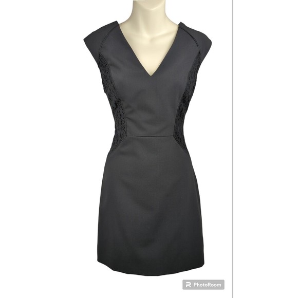 The dress features delicate lace panels adorning the sides, adding a touch of allure to its classic silhouette. With its flattering V-neckline and chic cap sleeves, it effortlessly accentuates your feminine grace.