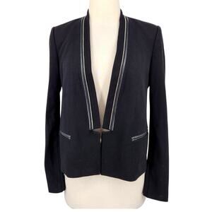 Rebecca Taylor Blazer – Black Open Front Hip-Length Jacket with Zipper Detail & Faux Leather Trim