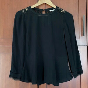 Black blouse with back lace panel, peplum, and sleeve detail from Rebecca Taylor.