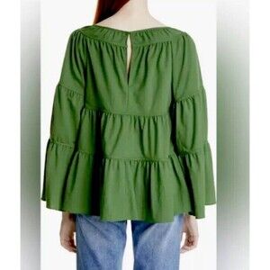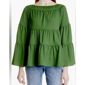 Elevate your wardrobe with this stunning Rebecca Taylor blouse. The green color, solid pattern, and ruffle accents make it a perfect choice for any season. The boat neckline and long kimono sleeves provide a relaxed fit, while the tiered pique design adds a touch of elegance.