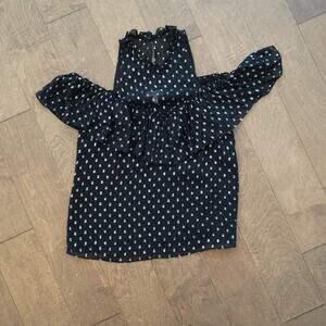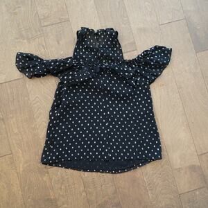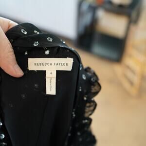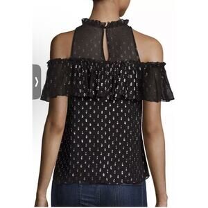 Rebecca Taylor Blouse Womens 4 Black Metallic Dot Silk Cold Shoulder Clip Ruffle.