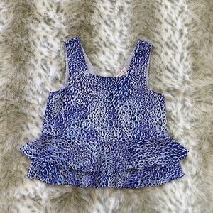 This Rebecca Taylor blouse features a vibrant blue and white peplum design, perfect for a chic and casual look. The sleeveless top is crafted from a lightweight fabric, offering a comfortable and airy feel. Its scoop neckline and flared waist add a flattering touch to any outfit. As seen on Emily Osment in Hannah Montana. In like new condition.
