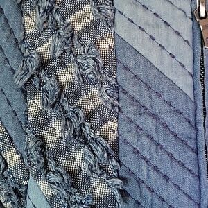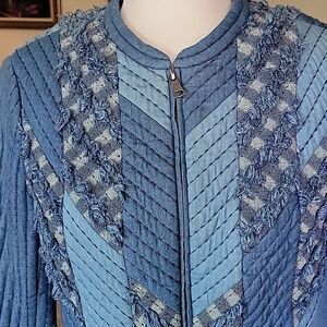 Fitted quilted jacket with mixed print and textures. Features a zip closure. Perfect for layering. See pics for measurements. Love it but a bit too snug for me.