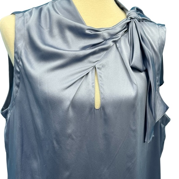 Elegant satin blouse with a unique neckline. Features a stylish bow detail. Sleeveless design for a chic look. NWOT. From my personal closet and never worn.