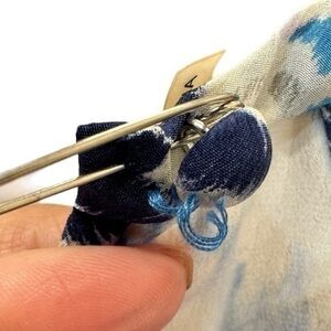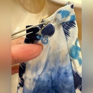 Rebecca Taylor Blue White Cloud Halter Silk Dress with a back button closure, the button did come off and it’s now pinned. See picture. The front dress does have ruffles and an elastic waist band.