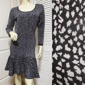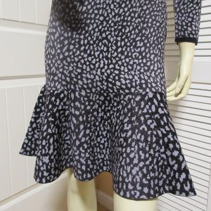 Rebecca Taylor womens sheath stretch bodycon knit sweater dress with 3/4 sleeve or cropped long sleeve. Multicolor (black with silver gray/grey). Spotted or abstract animal print (leopard), black based with silver spots. Fishtail or flounce hem or wide ruffle detail at bottom. Scoop neckline. Designer dresses, 100% Authentic. Excellent condition, preowned. Sweater dress, thick heavy fabric. Material is 63% Viscose 37% Nylon.