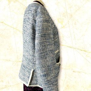 Rebecca Taylor Tweed blue and white jacket with metallic threads shot through. Snap front closure with white woven trim, and pockets with silver buttons. Perfect for career wear or over jeans on the weekend. Preppy, professional, classic blazer.