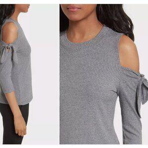 Chic ribbed cold-shoulder top with self-tie detailing. Ties below the shoulder cutouts add just the right note of feminine flavor to a pullover in a stretchy ribbed knit.