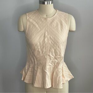 A wardrobe-staple top gets a feminine upgrade with a ruffled peplum that keeps its flounce in a crisp linen blend textured with stripes. Hidden back-zip closure - Jewel neck - Sleeveless- Dry clean. Perfect for the office or wear with jeans. Peplum is coming back big time don’t let this get away.