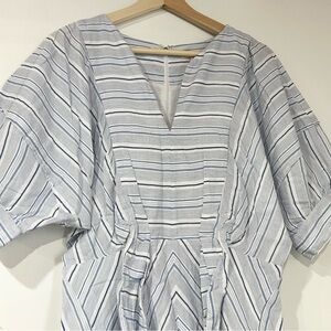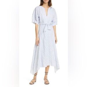 Rebecca Taylor Directional Stripe Belted Cotton Linen Midi Dress Blue White 6