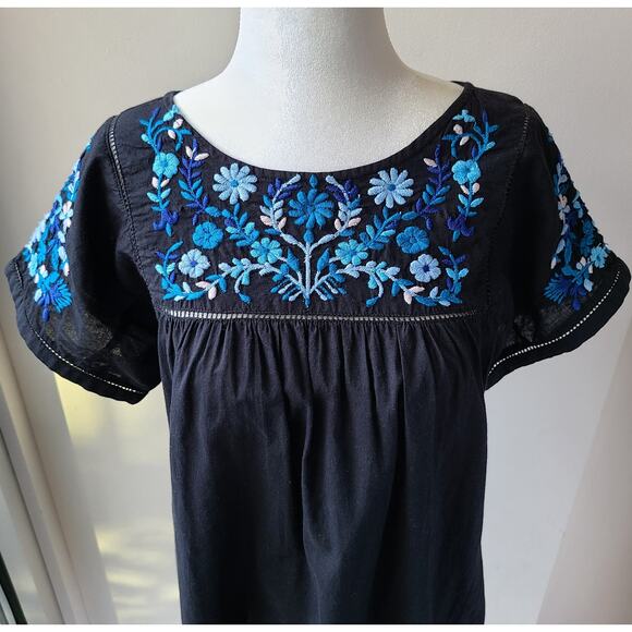 Rebecca Taylor black mini shift dress with vibrant blue floral embroidery, scalloped eyelet hem and delicate details, short sleeves, scoop neck, and back button closure. An adorable, lightweight, spring / summer sundress with cotton lining.