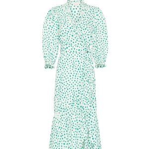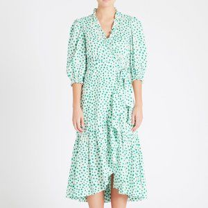 This Rebecca Taylor Emerald Daisy Ruffle Detail Cotton Dress is a cool vacation look featuring a chic floral print, ruffled trims, and a wrap V-neck front.