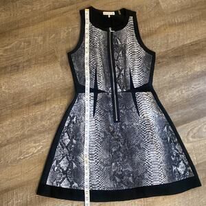 Excellent preowned condition. No rips, stains, or odors. See all photos. The measurements are in the photos. Please review carefully. Rebecca Taylor black gray and white python snake print fit and flair dress. Zipper front. Waist detailing. 100% polyester so it does have some stretch. Back is solid black.