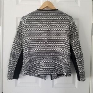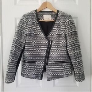 Surplice neck - 3/4 length sleeves with rib knit stretch panel - Front partial zip closure - 2 front zip pockets - Tweed construction - Faux leather trim - Lined.