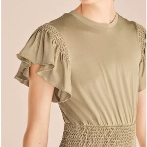 Muted jersey composes this low-key Rebecca Taylor dress, which features fluttery sleeves and smocked waist for a nice blend of slouchy and fitted proportions.