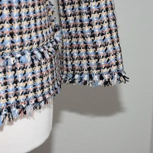 This fresh fall tweed jacket features light shades of robin’s egg blue, blush, and beige that pop against a black background.