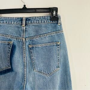 High rise straight leg. Patchwork detail.