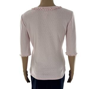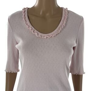 Rebecca Taylor La Vie pink pointelle top. Scoop neck. Half sleeves. Pulls on. Ruffle / lettuce edge details at the neck and sleeves. Cotton. Machine wash. In preowned condition.